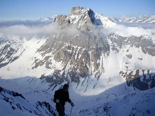 На фото вдалеке, чуть выше траверса, на гребне видно мачту станции) умудрились чутка скатиться по не распаханному и на выкате "ушли в гору". Тропинка по леднику ведет к фотографу на гребень. Это был первый длинный и долгий подъем на соседний контрфорс Borgne.