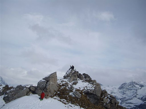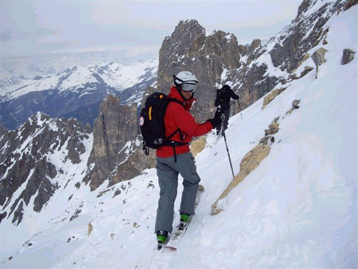 потом опять траверс (по-быстрому - лавиноопасный участок, да еще на заходе солнца). И круто вверх.