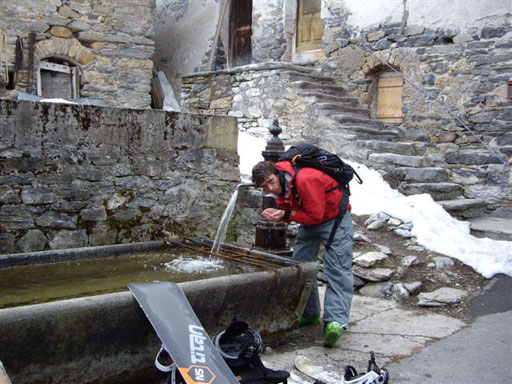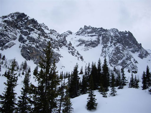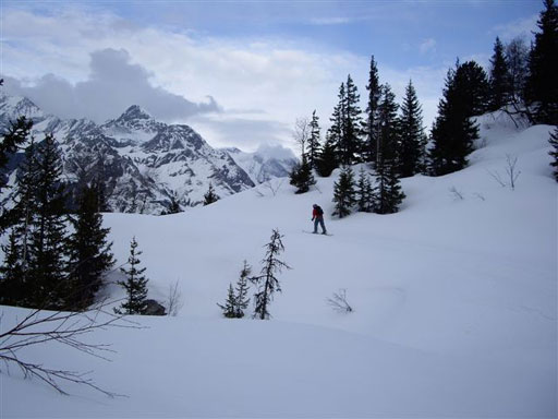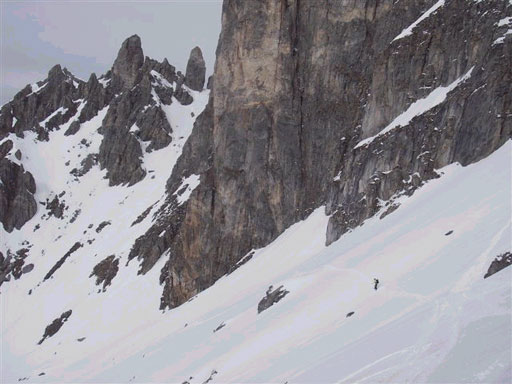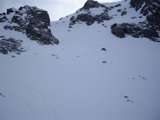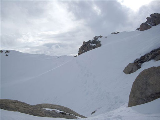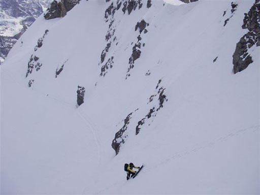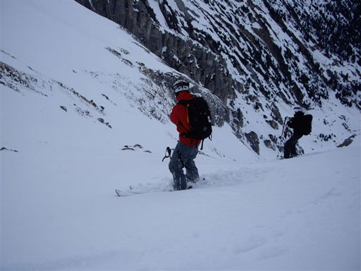 На противоположном склоне видны следы групповых спусков. Да и крутизна подъема "чувствуется". (ИХМО: "кошки" бы не помешали, "тупые" носки сноубордических ботинок радости не доставляют)