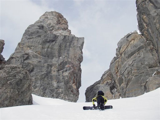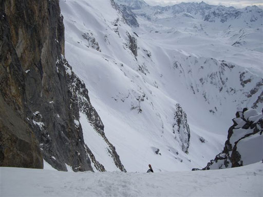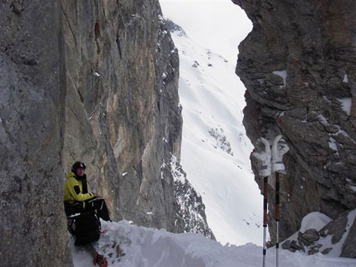 Долбанув ступени, 100м по крутому фирну, можно легко попасть в красивое место между скал.