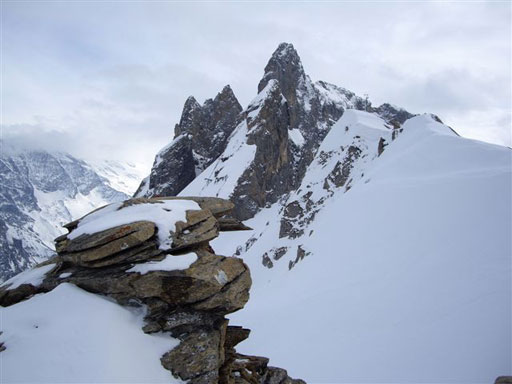 Оставив вершину Aiguille de Mеy справа, траверс под скалами (стараясь минимально потерять высоту).