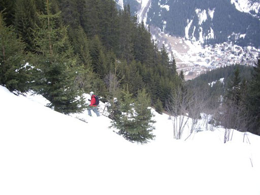 На подъемниках поднялись в юго-восточную часть Куршевеля и начали спуск в долину реки La Rosier.