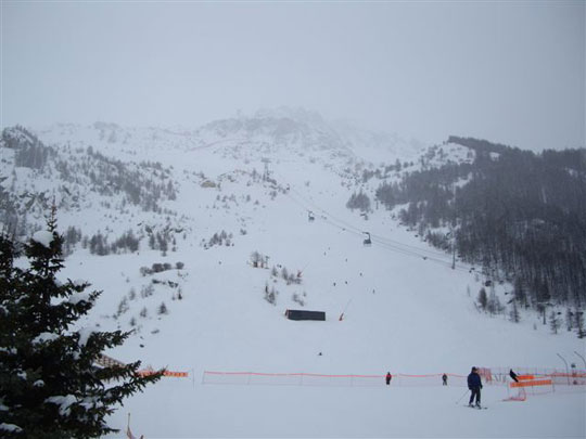 Облюбовали вот этот подъемник - le Laisine. Подъемник - открытая, длинная, медленная креселка. Но лесные склоны (слево на фотке) очень даже бодренькие. Очередей, к великой радости, на посадке нет.