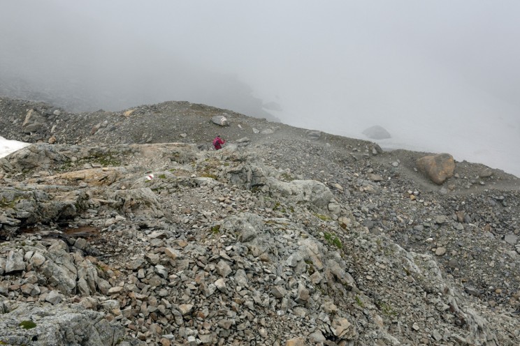 Спуск с северной стороны перевала, в долину Гастернталь, несколько сложнее - по не очень пологим скалам, по моренам, снежникам. К тому же туман здесь, над снегами, благополучно лежащими в тени хребта - чем дальше, тем гуще. Похоже, его здесь включают регулярно, каждый день после обеда, чтобы впечатлительным натурам, идущим на спуск, было не очень видно, докуда им придётся лететь в случае чего. Но тропа хорошая, если её не терять.
