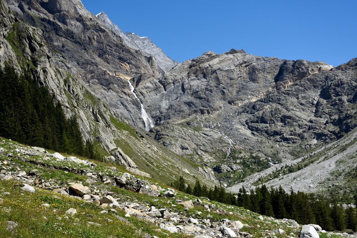 В разрывах облаков можно увидеть в глубине долины обширный ледник Кандерфирн. Где-то за ним, после скального островка Муттхорн и перевала Цшингельпасс, вода течёт уже в Лаутенбрюненталь, под ту самую гору Шлитхорн со зловещей станцией Пицца Глория... а там и до милого Свиссмейкеру Гриндельвальда рукой подать. Внизу - речка Кандер. Напротив - хребет Блюмлизальп, за ним уже начинаются швейцарские Великие Озёра. А справа Лётчберг, набирая высоту, уходит за ледник, к Юнгфрау, Эйгеру и Мёнху.