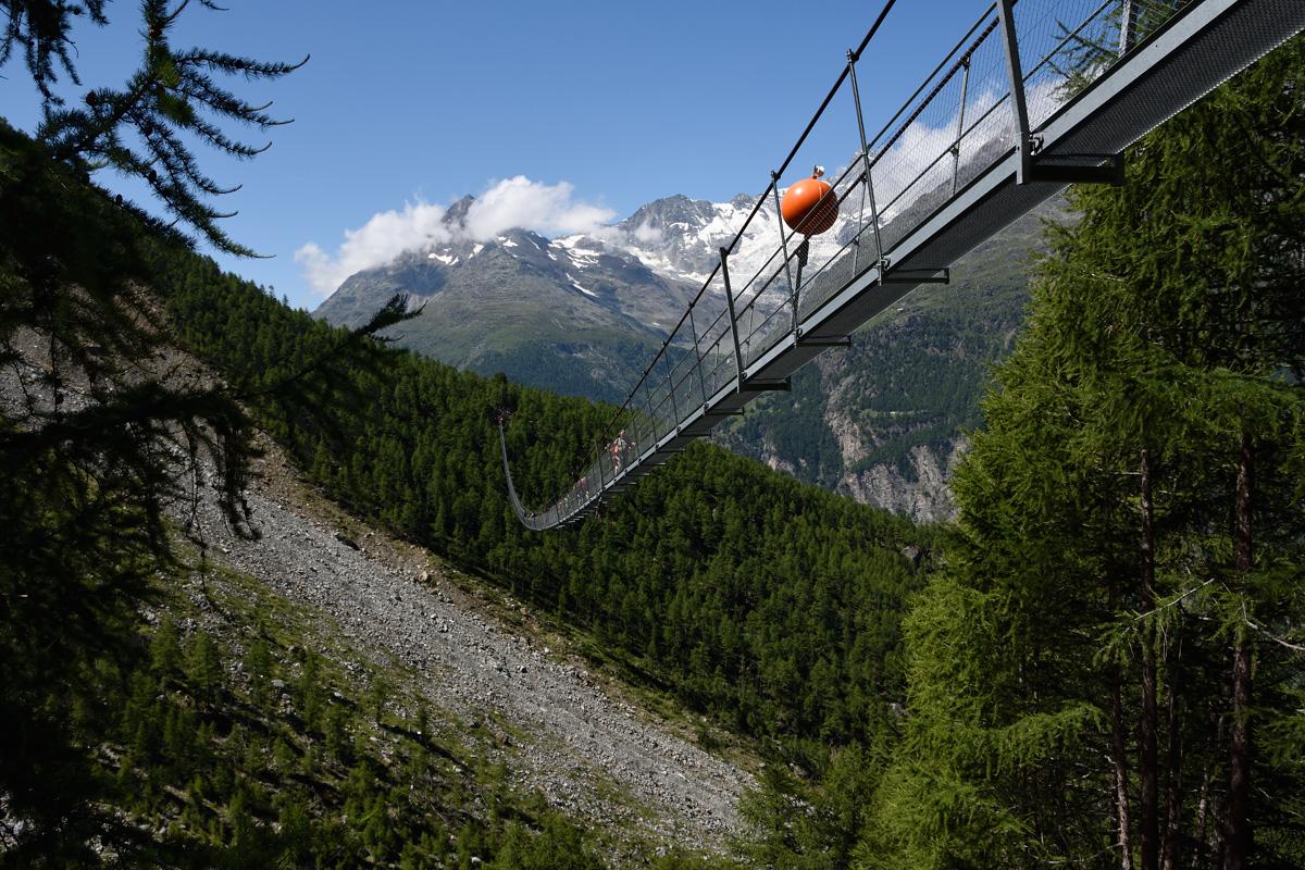 Мостик над деревней виден издалека - прямо из окна поезда где-то за километр до станции. Кольцо Монте-Розы - популярная туристкая тропа, идущая здесь по борту долины на высоте около 2000 м - пересекает большой распадок ручья, бегущего с ледников Дома и Ленцшпитце. Хотя сам ручей летом невелик, но то ли курумник в распадке слишком подвижен, то ли риск селей и оползней слишком велик, то ли просто полкилометра лазания по крупным камням выходит слишком далеко за рамки евростандарта для троп туристических... в общем, через распадок давно уже был построен подвесной мост. После того, как старый мост пришёл в негодность где-то в начале нынешнего тысячелетия - ничто не вечно даже в Швейцарии, увы! - приходилось спускаться до самой Ранды, переходить ручей по мостику внизу и подниматься обратно те же 600 м по другой стороне. Правда, люди там всё равно не ходят, только туристы - но всё равно ж непорядок.