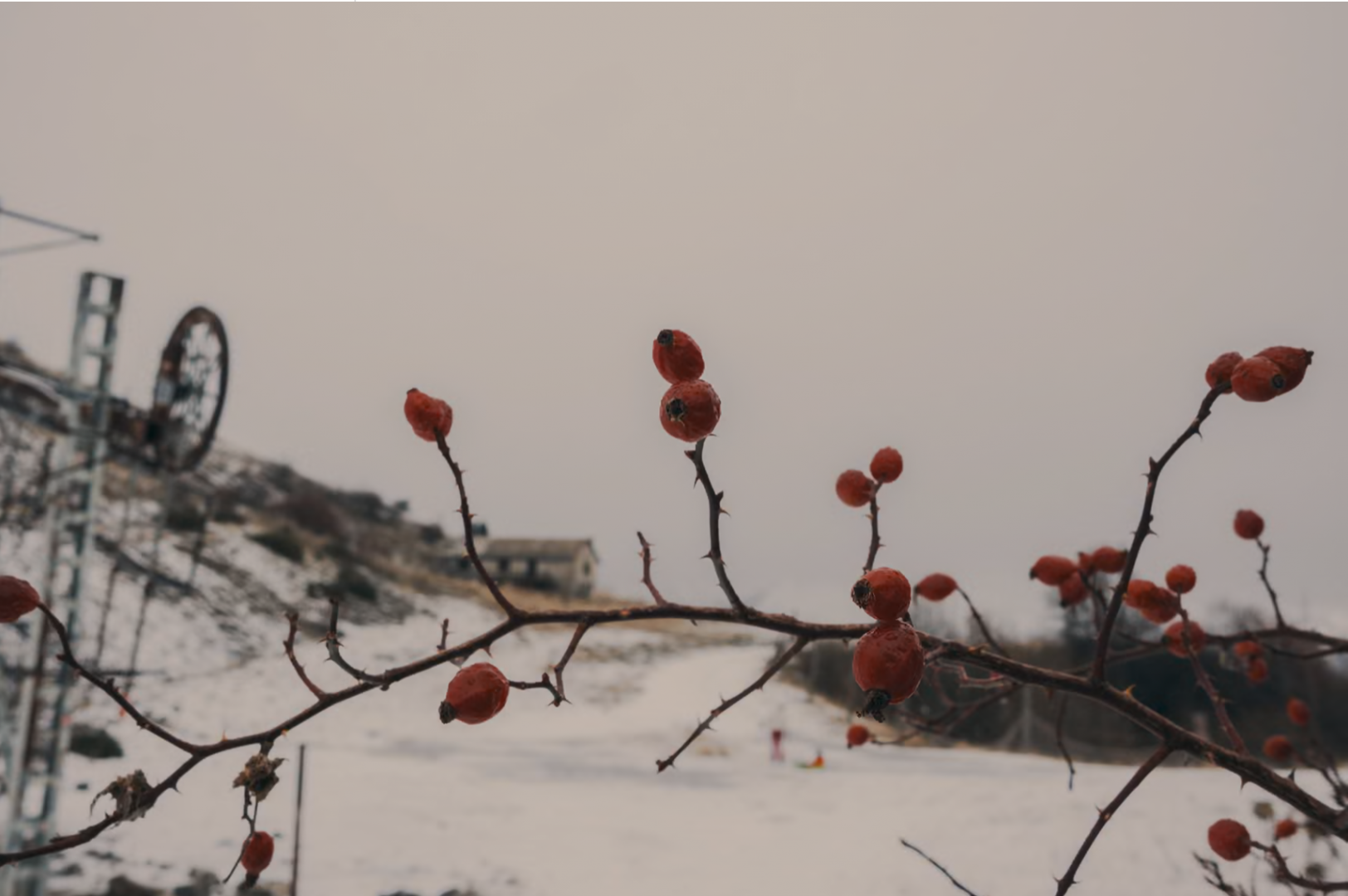 Красная дымка парит над белым снегом: зимние ягоды собачьей розы сверкают на месте бывшей трассы. Ягоды являются важной зимней пищей для птиц, таких как редкий красноклювый чох, и их колючие стебли используются для строительства гнезд весной. Летом на этих склонах цветут орхидеи и желтые гори.