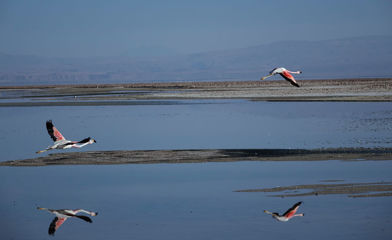 Lagunas Altiplanas - большой и разноплановый тур, в, как указывает его название, высокогорную часть Атакамы. 100+ км в один конец к югу и юго-востоку от города, на целый день. Первая остановка - на мелководном озере Чакса в южной части солончака Атакама: посмотреть вблизи на фламинго. Если их не пугать, то они и не боятся, как в зоопарке.
