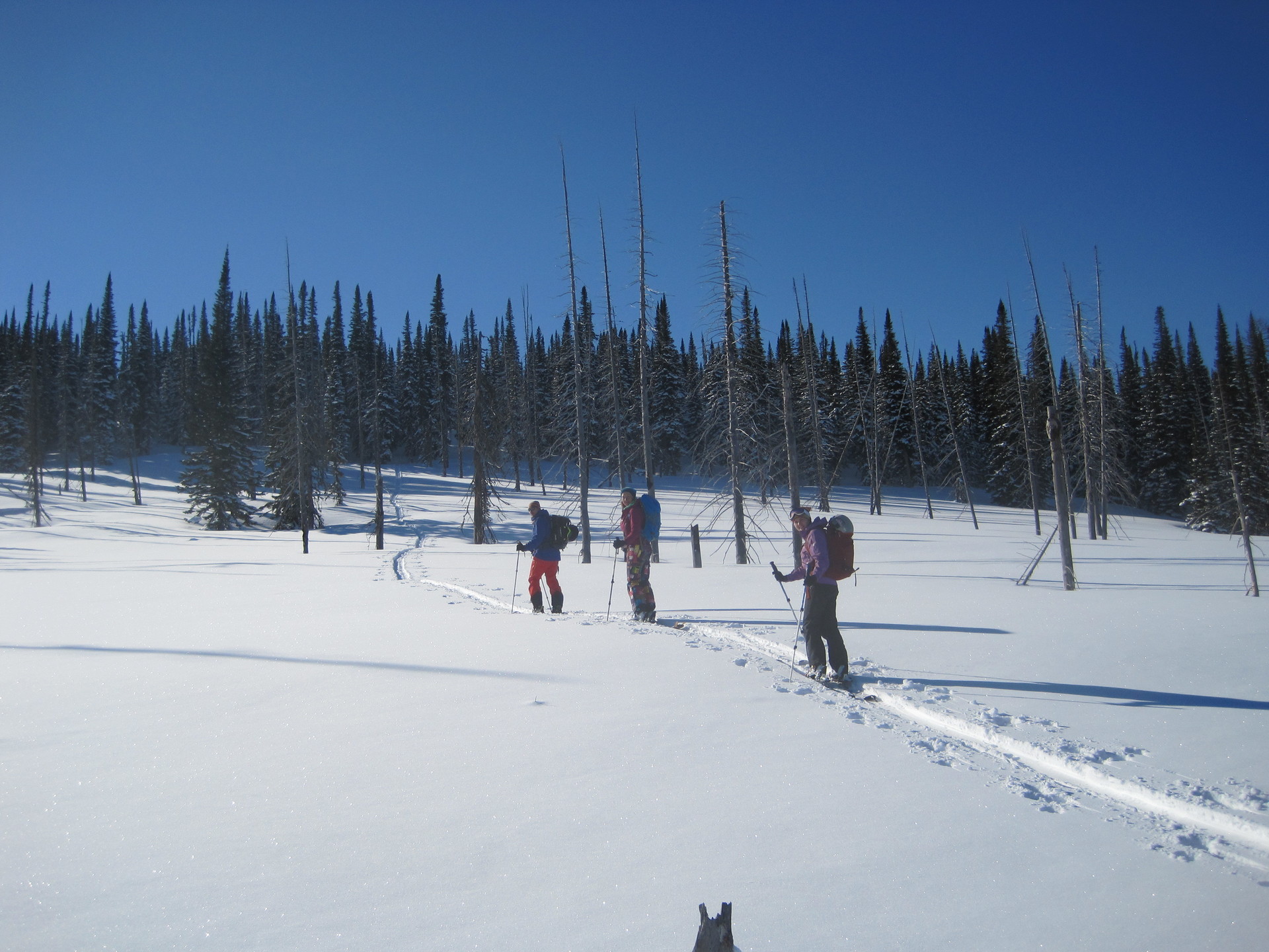 - Нет аццкой лавиннопасности. Конечно, лавинноопасные логи есть, но они хорошо видны. После снегопада, бурана или резкого перепада температур ничуть не обломно пару дней прокатать в редколесье, а уж потом замахиваться на более крутые склоны.