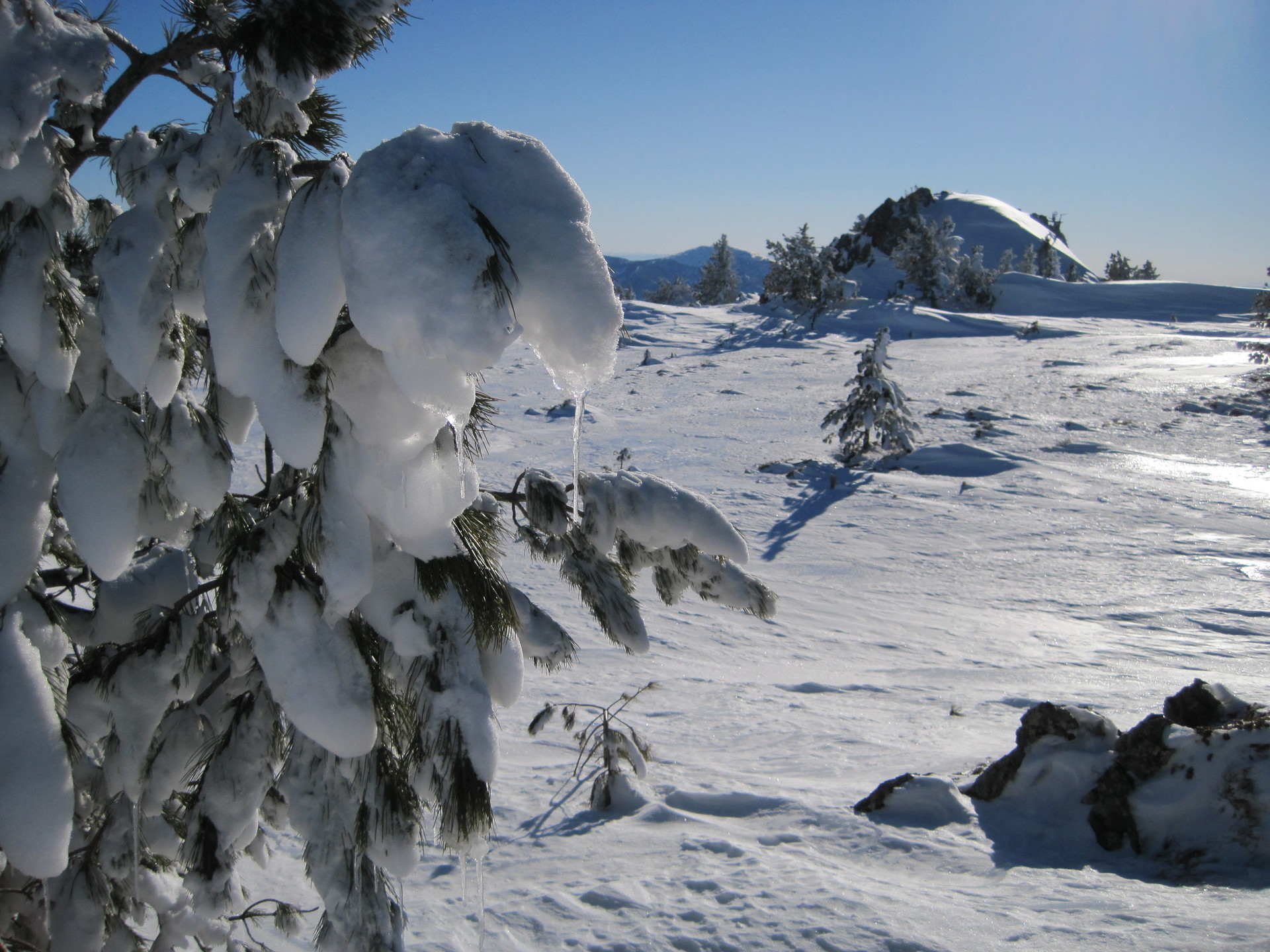Максимальная высота белка – 2076м. Наверху – несколько живописных каменных гряд, под ними вечно мульды, наверху – остатки горевшего 20 лет назад леса, выветренные за двадцать зим его обломки образуют вкупе с камнями странную и прекрасную икебану. Скатываться с большинства каменных гряд нельзя, нужно их обходить. Впрочем с «сосисочного» камня можно (сосисочным мы его прозвали после того, как нашли там окаменелые сосиски, оставшиеся от осенних прогулок местных туристов. Собаки их не ели). В этом месте уклон наверху очень маленький, начинать скатку с каменной гряды – исключительно эстетическое удовольствие, хороший уклон и снег из-под канта выше головы будет метров на 200 ниже. Но соблазн дотопать до самого верха и увидеть сверху староверский Рудный Алтай, плавные, рериховские линии гор, соблазн начать спуск, глотая слюнки от вида этой роскоши, непреодолим. И скитурщики терпеливо добредают эти метры.