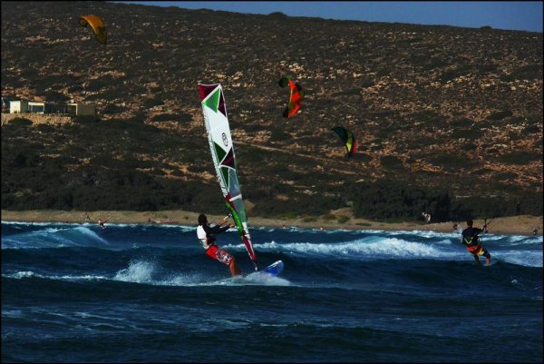 В Прасониси два варианта катания: флэт слева от мыса или вейв справа. Размявшись на флэте, отрывались на вейве. Место, кстати, отличное для первых шагов на волнах. Получается парболической формы залив с прижимным ветром. Почти вся площадь катания мелкая настолько, что стартовать можно стоя на дне, что весьма облегчает катуху. И есть выбор: хочешь волн крутых с пеной, попрыгать - иди где мельче, хочешь высоких и пологих, покататься в стиле гравитационного серфинга - иди на глубину. К тому же, если не можешь вырезаться выше по ветру - просто по берегу поднялся и стартуешь куда хочешь.