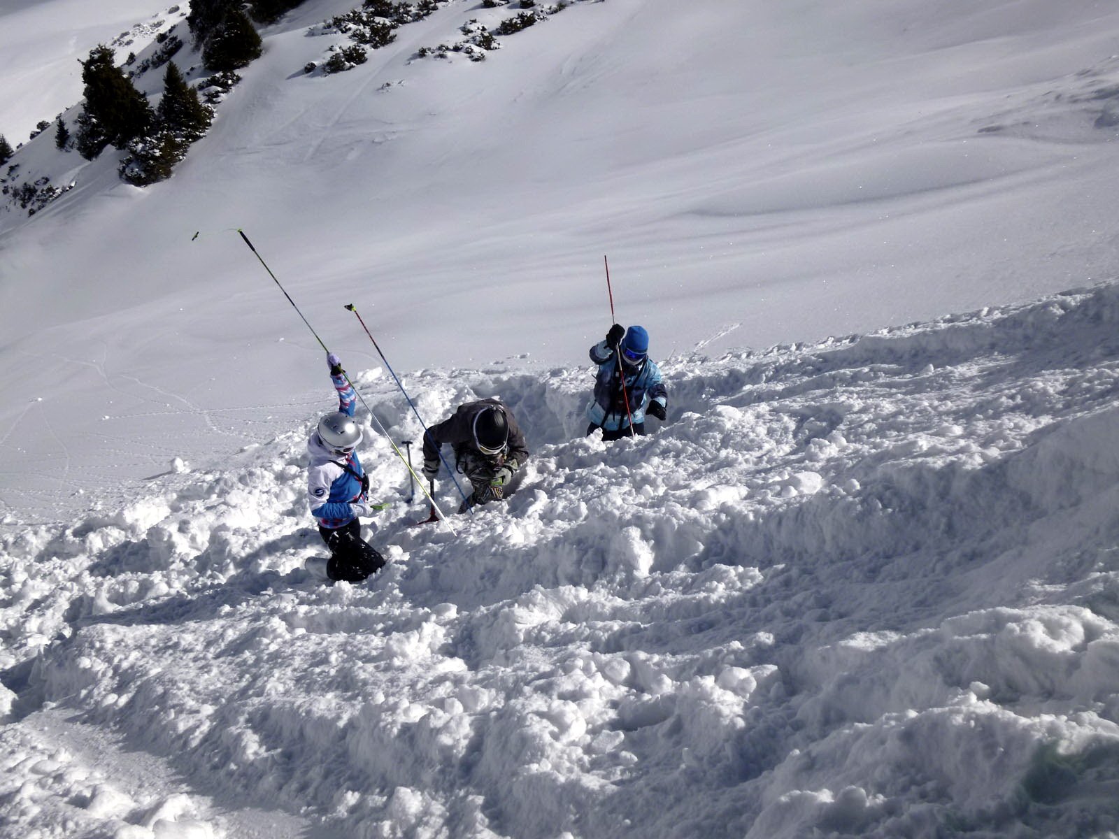 У нас следующие 3 часа уходят на то, чтобы собрать всю группу вместе, и съехать в долину по относительно безопасному гребню вдоль кулуара.