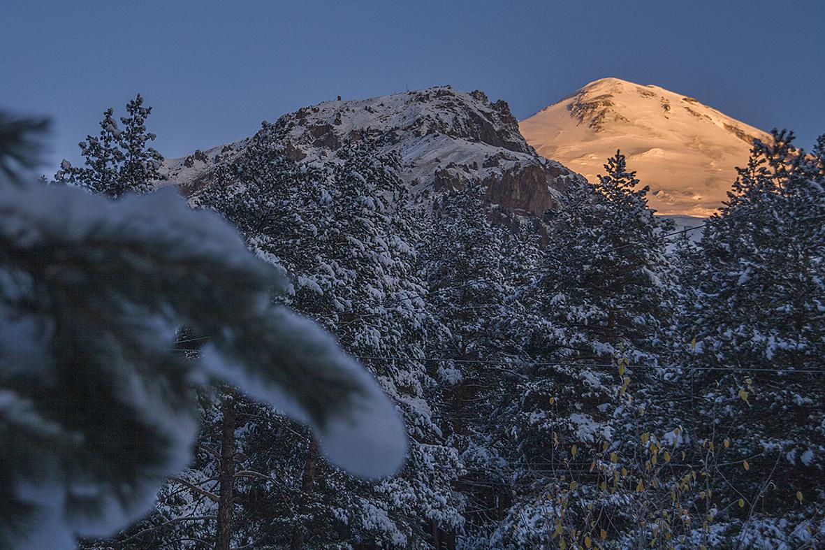Разместились в комфортабельном отеле в сосновом бору на Чегетской поляне с видом на рассветный Эльбрус и в приятной и полезной близости к нарзанам