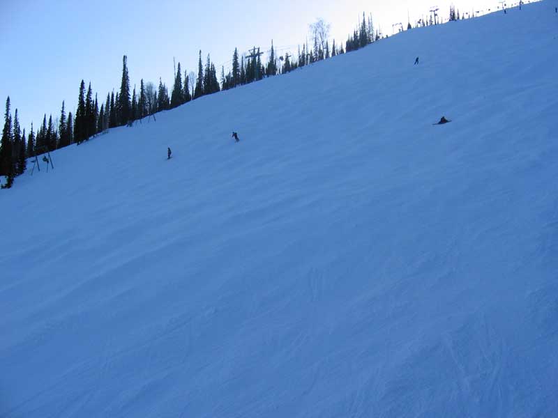 Как ни странно, трассы оказались очень ухоженными, ратрачили практически каждый день, оставляя, правда один бугристый участок, видимо, для могулистов. Для фрирайдеров насколько я понял, там вообще рай – очень много мест для катания, предлагается даже хели–ски, хотя фрирайдеров, в основном, доставляют на необъезженные склоны снегоходами. Для совсем чайников есть длинный, широкий и очень пологий участок внизу горы. Основных трасс две, видел, что строится третья. В общем. катание очень разнообразное, реально - на любой вкус.