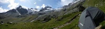 И мы расположились на ночлег в получасе ходьбы от хижины, на травянистой полянке (последней, перед мореной и снегами).