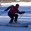 Вижу внизу стартовавшей первой группу, Миша стоит на одной ноге отдельно от лыж! Сбрасываю скорость, подъезжаю. Оказывается его размотало на спуске при переходе на корку, лыжи выстегнулись, а он словил «головонога»