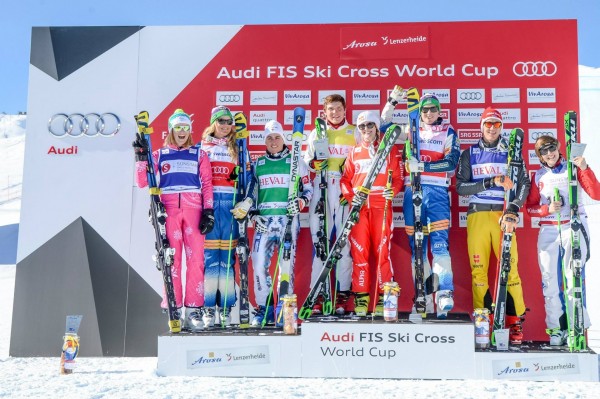 FIS World Cup, Ski Cross, award ceremony. Image shows the podium of the ladies and the men with Karolina Riemen-Zerebecka (POL), Anna Holmlund (SWE), Jean-Frederic Chapuis (FRA), Sergey Ridzik (RUS), Fanny Smith (SUI), Victor Oehling Norberg (SWE), Daniel Bohnacker (GER) and Sofia Smirnova (RUS).