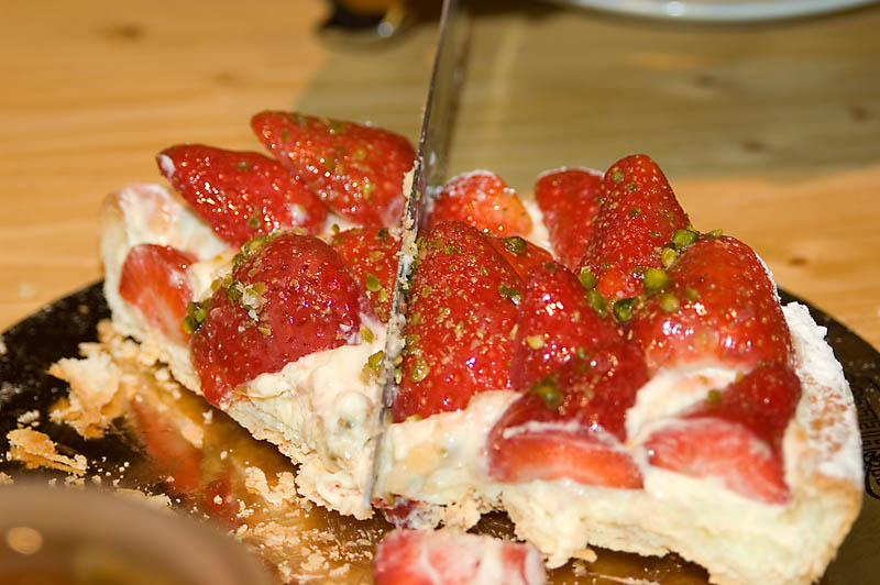 Форма типа "Наполеона" - несладкий жесткий корж, потом вкусный почти несладкий нежный крем, сверху ягодки, посыпанные фисташковой крошкой.