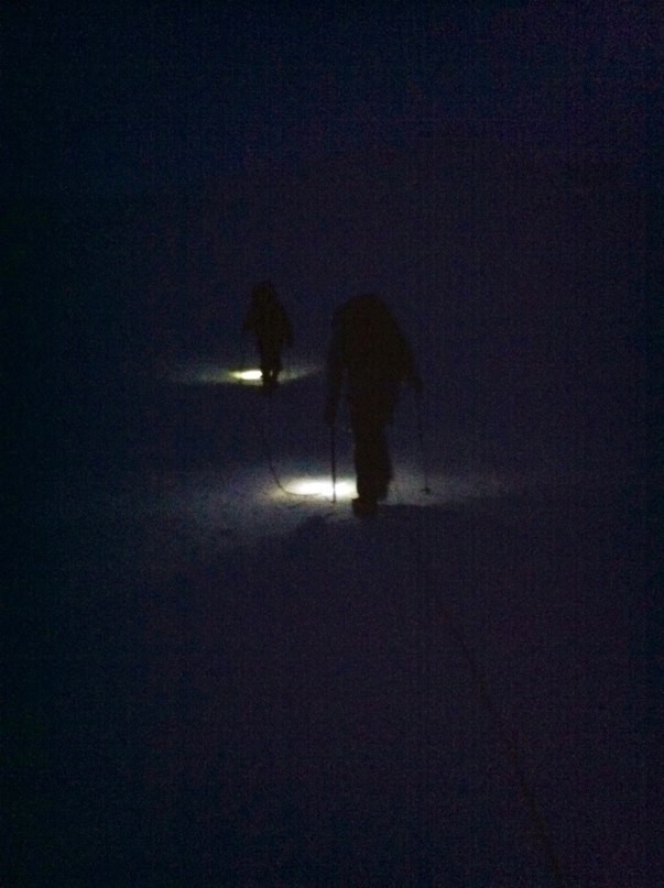 Идти в связке оказалось для меня испытанием, так как ты должен соблюдать дистанцию, чтобы впереди идущему партнеру не пришлось одергивать связывающую вас веревку, плюс ты постоянно наступаешь на веревку, коря себя, что можешь ее испортить. Когда оставалось сделать около 200 метров перепада, началось веселье. В голове поселился стук, на правой ноге сильно намял подушечку большим пальцем, ну это профессиональная сноубордическая проблема, к которой я привык, но по-прежнему не мог привыкнуть, что подъем не кончается, а идем уже 1,5 часа, и была только одна остановка на пять минут. Ветер усиливался с каждым шагом, но периодически раздувал облака, и лунный свет, стелящийся по заснеженным склонам, бодрил своей красотой. Перевалив за пару часов, мы увидели приют, что, конечно, в районе 12 часов ночи и 6 часов в пути не могло не радовать, но даже при таком раскладе я готов был идти к вершине дальше, ведь осталось около 500 метров набора. Что было бы реально, если бы не 12 часов ночи.