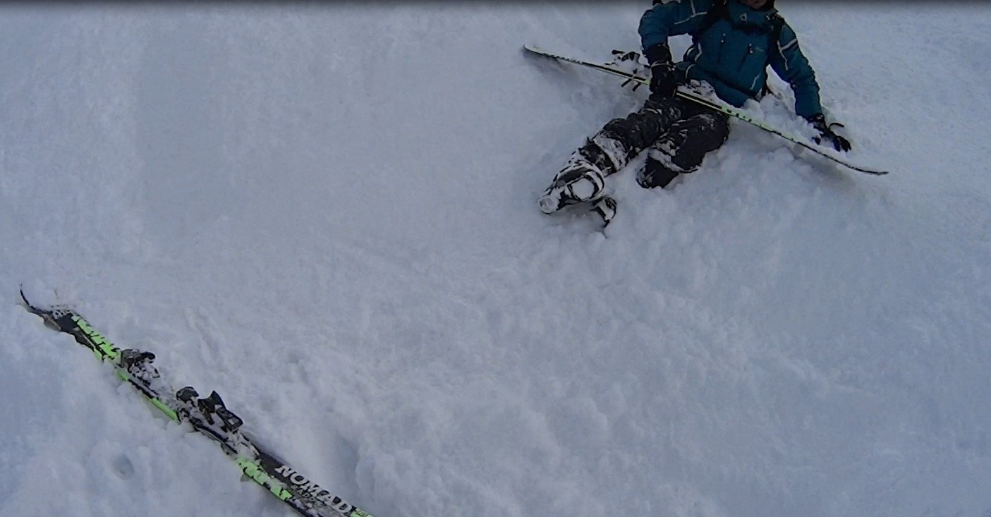 Вход в кулуар закрыт огромным снежным надувом, но его можно объехать слева. Я же еду через надув посередине. Прыжок. Небольшая ошибка на приземлении. Срабатывает крепление. Лыжа отсёгивается и скользит вниз. Но обошлось - застряла в снегу.