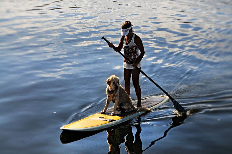 - SUP это не только рейсинг и йога. Можно целый день путешествовать по реке или озеру с любимой собакой, фотокамерой, удочкой.