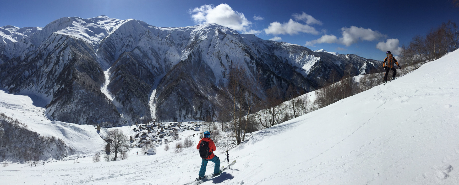 Нам повезло что приехали как раз на свежий снег! Но в этом году Тетнулди уже набрал некоторую популярность и народ на второй день после снегопада уже исчертил все прилегающие к трассам склоны) В поисках нераскатанного снега спускались в деревни Адиши и Жабеши, заранее договариваясь о подборе. В Жабеши по незнанию сразу попали в ручей, где местами ехать было невозможно и приходилось выстёгиваться) В Адиши уже взяли гида. Вокруг в деревне красота! Познакомились с местной фауной)