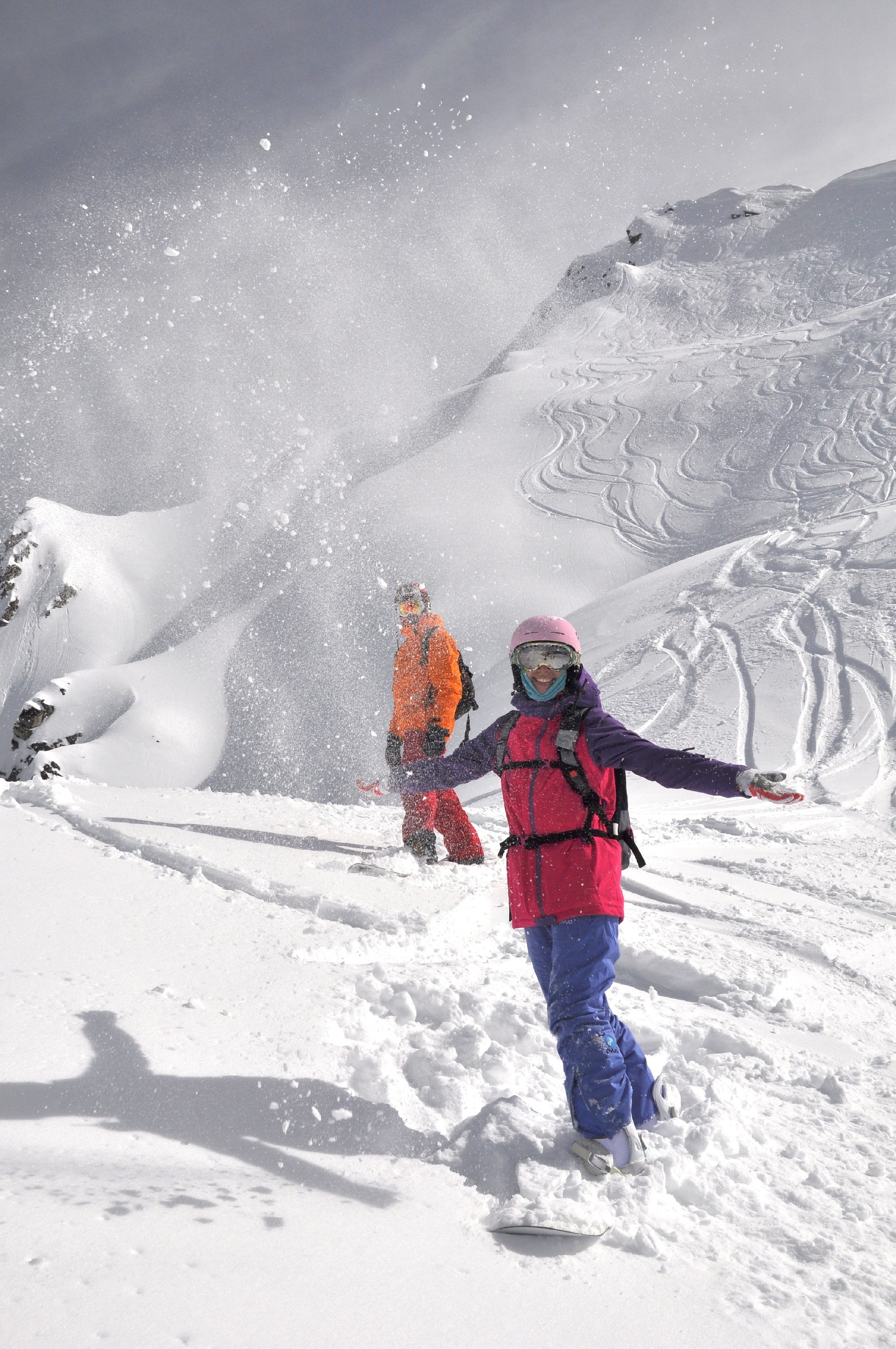 Для таких как мы специально включали третью очередь подъёмника и мы поднимались на креселке с 3040 до 3165. Далее проходили пешком по гребню (высота 3200м) и спускались через лавиноопасную зону. После схода лавины в начале января 2018 перед этой зоной появились предупредительные таблички и ограждения, но всё равно народу там катается очень много. Мы не пренебрегали безопасностью! Спускались по самой простой линии, аккуратненько уан бай уан и останавливались фоткаться только в безопасных местах) Конечно катались все с лавинным снаряжением.