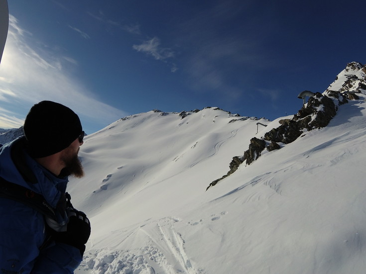 Ричи, который, теперь очевидно – Ричард, с нескрываемым энтузиазмом ведет меня в узкие кулуары, уходящие вниз с Gaislachkogl. Это немаркированный маршрут, и даже не входящий в карту зон фрирайда , но я же с гидом, и мне выдали полный комплект – абс, бипер, щуп, лопата и даже сникерс. Так что, жжем вниз, я даже не знаю, кто больше радуется — я или мой гид…