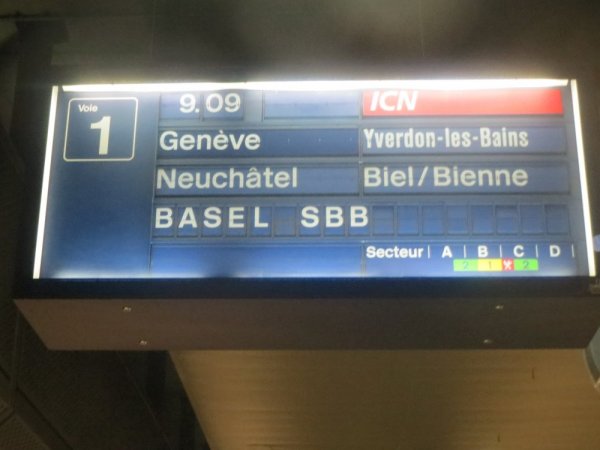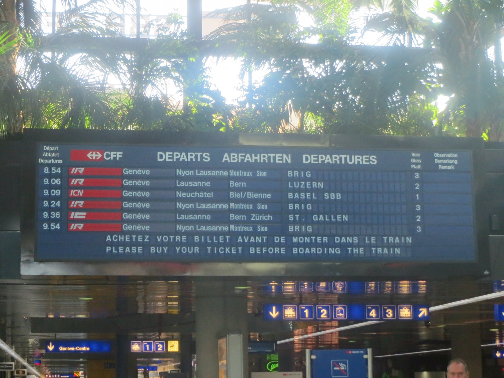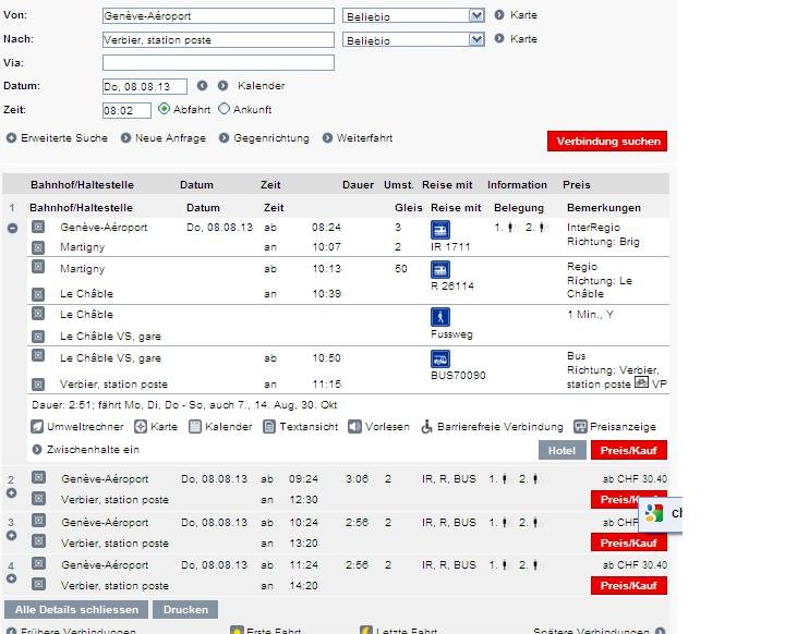 Вид транспорта, маршруты, время и место пересадок, платформы прибытия и отбытия и тип поездов можно посмотреть на сайте http://www.sbb.ch/