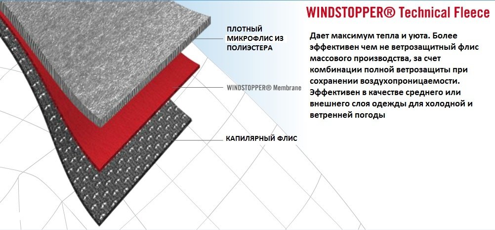 Многие известные фирмы производители также используют трехслойную ткань WINDSTOPPER ® technical fleece состоящую из сверхтонкой мембраны WINDSTOPPER®, расположенной между двумя флисовыми слоями. Флис идеально подходит для занятий бегом, альпинизмом при прохладной, но не при холодной погоде, в роли среднего или верхнего слоя.