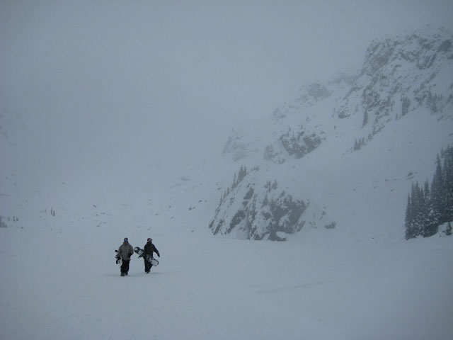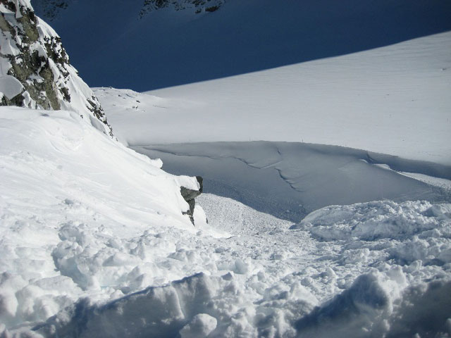 Кто-то уже прикидывает спуск по следам лавины, перед наддувом. Вся сложность в том, что место старта гораздо шире узкого прохода к перегибу.