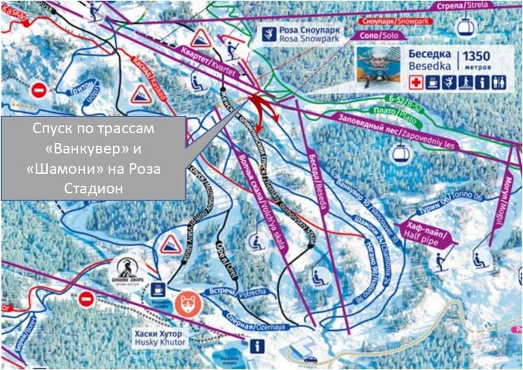- самый простой и быстрый уехать на “Роза Стадион” по синим трассам “Ванкувер” или “Шамони”