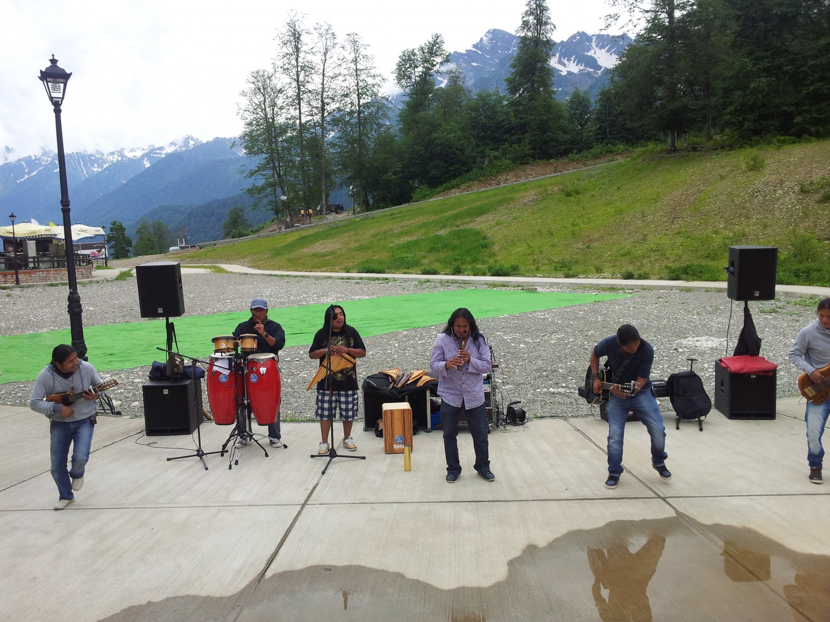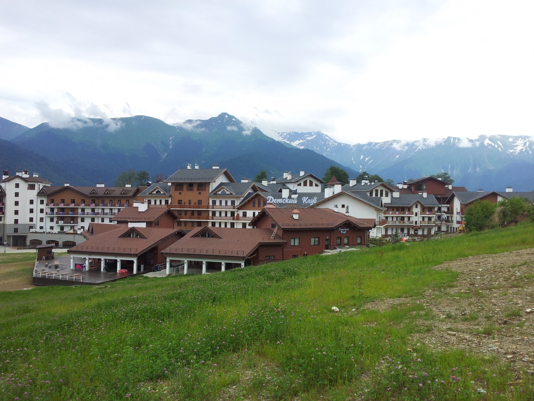Роза плато – самый верхний поселок (Олимпийская деревня), не такой чопорный как остальные станции, местами нарядный, с многоэтажными и не очень в основном комплексами апартаментов и гостиницами, с флагами на домах от проживавших во время Олимпиады. По архитектуре – местами напоминает квартал апартаментов в Chamonix Sud. Жизнь здесь крутится вокруг станций подъемников: сувенирные лавочки, кафешки, ансамбль явно не местных музыкантов. Спуск на центральную станцию Роза-долина работает до позднего вечера даже летом. Зимой, здесь, наверное, одно из оптимальных мест при преимущественном катании на Розе-хутор.