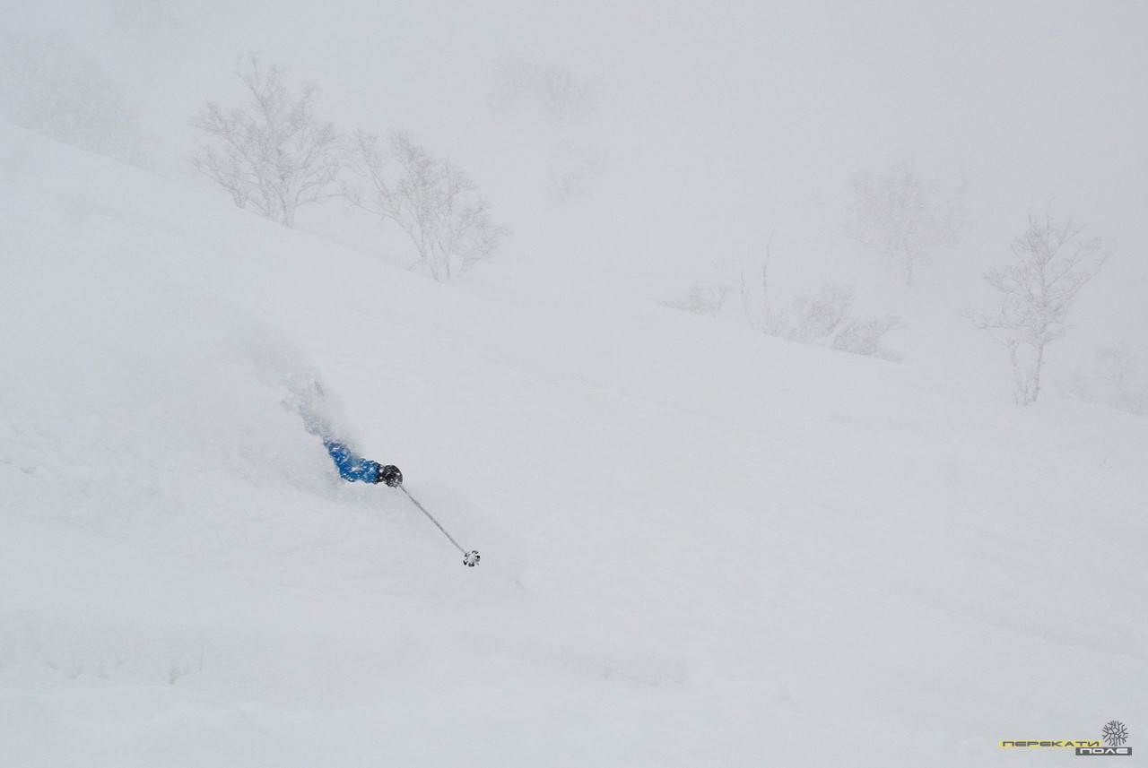 В первый день мы катались справа от Ханазоны. Снег шёл и шёл. Ничего кроме карликовых берёзок не было видно, но мы знали, что вулкан где-то рядом. Особо избалованные участники нашего коллектива поговаривали, что снега маловато, подложка жестковата и задавались вопросом, стоило ли лететь через пол света чтобы катать с Хибинским перепадом. Проснувшись следующим утром, мы поняли, что вчера снег не шёл, а идёт он сегодня. И так непрерывно все последующие дни. У фотографа была задача поймать хотя бы фрагмент лыжника в момент его появления над снегом. В основном катание происходило со снегом летящим через голову.