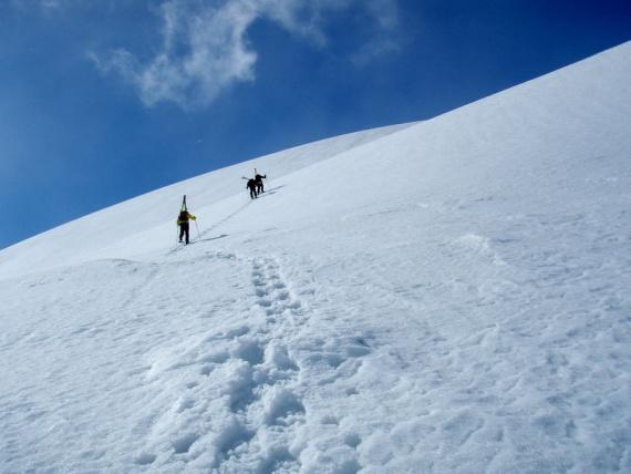 Мерными движениями вгоняю кошки снегоступов в податливый, размягченный солнцем снег. Остается буквально метров двадцать до выхода на гребень. Под ногами огромный крутой снежный склон, уходящий в небо. Двадцать метров как квинтесенция четырех часов пахоты для уставшего тела и предтеча того, ради чего нужно это самоизнасилование – спуска на лыжах. В ногах легкая дрожь.