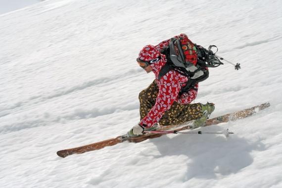 Катание в таких условиях получается довольно смешным. Приходится гнать свои ощущения далеко впереди лыж. Для лыж это тоже проверка. Грустят фрирайдные лыжи, привыкшие вгрызаться в склон, радуются черепастые уроды с окровавленными литовками на Сашкиных Хэлбэндах – их рокер сейчас очень пригождается их наезднику, взлетает над склоном нос Сергеичевой доски, мои Скоттибобы отнеслись с пониманием к происходящему – во всяком случае не вышвыривают в несколько тяжеловатой целине. А целины много, очень много, сколько еще не было! Финальный спуск сезона напоминает первый в декабрьском Геше. Вот это «закрывашка» получилась!...?