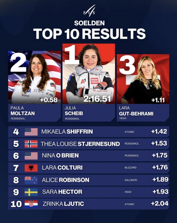 Австрийка Юлия Шайб выиграла гигантский слалом Кубка мира в Зёльдене, опередив Паулу Мольцан и Лару Гут-Бехрами. Микаэла Шиффрин заняла четвёртое место после сильного второго заезда.