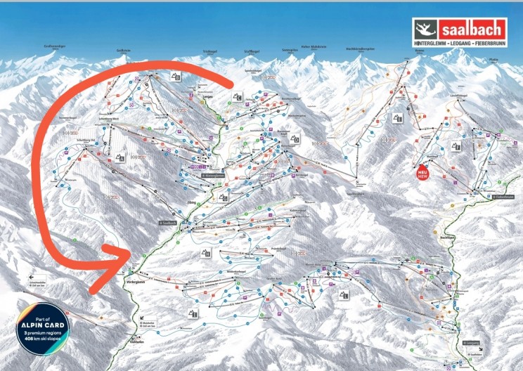 В итоге круговой маршрут Заальбаха Skicircus Saalbach Hinterglemm Leogang Fieberbrunn, проезжаемый если сильно не тормозить за 6-7 часов с коротким обедом, теперь однозначно в топе и лично моё мнение, что он гораздо интереснее Села Ронды в Доломитах по конфигурации трасс и логике соединения подъёмниками.