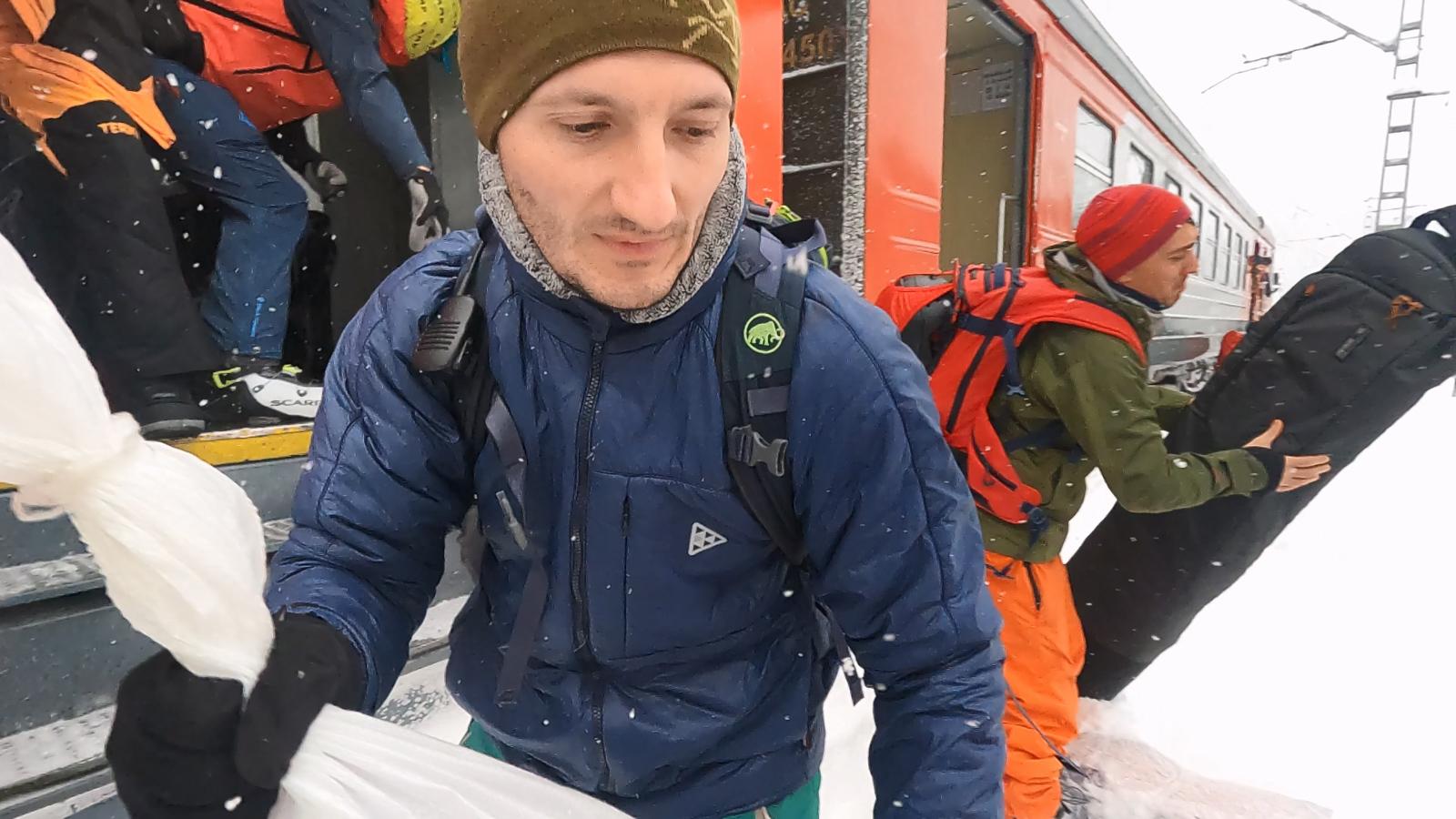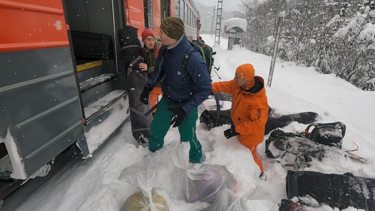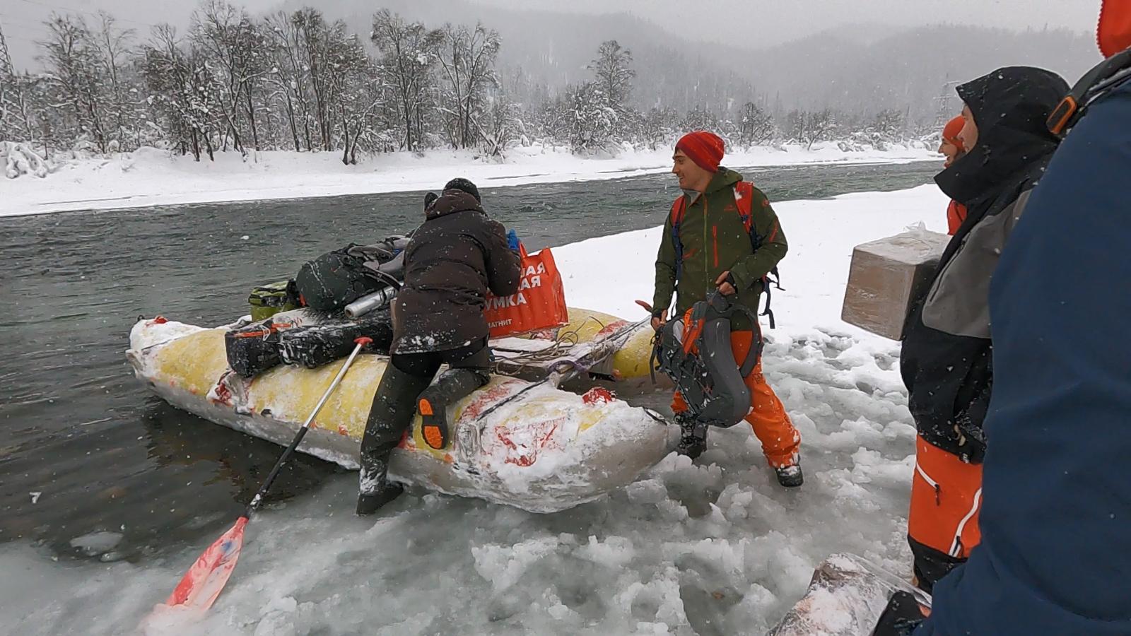 Десантирование из электрички по пояс в снег, переправа на катамаране через стремительную реку полную созревающей шуги.