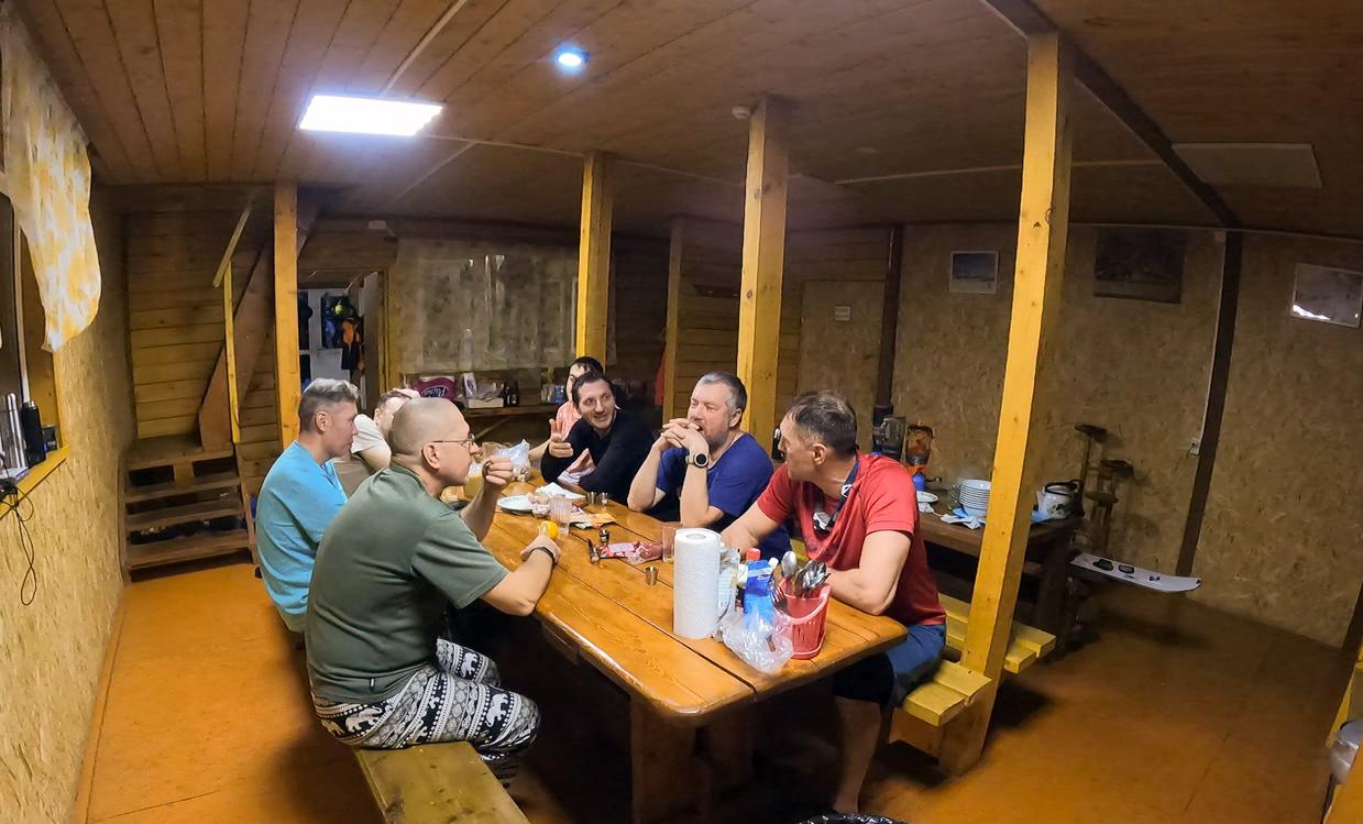 Темным зимним утром народ с налобными фонариками собирается на кухне. Никаких дежурных, просто кто-то ставит кипятить воду и вываливает туда кашу, кто-то шинкует сало и хлеб, собирает себе перекус. Но как правило нарезает впрок для всех. Все это молча, сосредоточенно. Никаких руководителей и инструкций. Сами включают биперы, проверяют рации. В первые дни стихийно разделились на группы, но каждый выходят по готовности, все равно гора всех соберет на очередном крутом подъеме или тропежке.