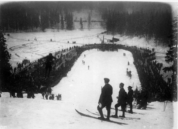 Holmenkollrenn, Oslo. 1908-1910. Vintermotiv. Hoppbakken sett ovenfra.Hopper i svevet. Publikum.