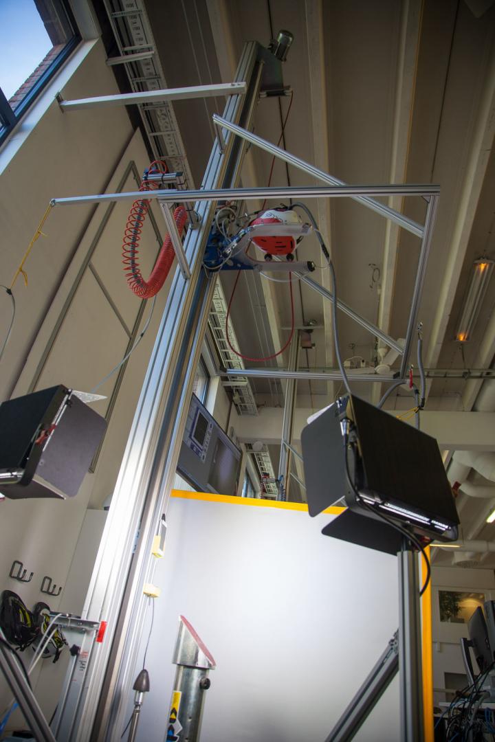 Ниже - демонстрация ударного теста при падении на наклонную плоскость. Шлем помещается на опору, которая поднимается на высоту соответственно желаемому удару.