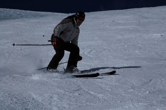 Первое, что приятно удивило на Эле – отсутствие очередей. Взорванную в ноябре прошлого года «француженку» починили, все работало как часы, если такое сравнение применимо к Кавказу. То есть канатка начинала работать примерно в 8.30–9.00, а заканчивала в 15.45-16.45. В праздники 23 февраля народу значительно прибавилось, но повалил снег и мы рванули на Чегет. Первый день на Че приятно удивил пухляком по колено. Пару спусков с «Доллара», пару с «Мечты сноубордиста». Потом мы решили прокатиться по дальним северам. Главная, свершенная мною ошибка, - я взял коллегу, не умеющегося кататься в таких условиях. А он на тоненьких карвовых лыжах. Первый километровый пролет по полю с верху Чегетского бугеля занял у меня 1 минуту и дал мне четкое понятие, что такое настоящий Чегетский пухляк. Катался я в Болгарии, в Австрии, в Кировске. Но такого я не испытывал нигде. Чистейший нетронутый снежок, по которому ты не едешь, а плывешь.