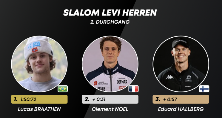 Лукас Пиньейро Браатен выиграл воскресный мужской слалом в Леви, опередив француза Клемента Ноэля (+0,31) и сенсационного бронзового призера Эдварда Холлберга (+0,57) из Финляндии.