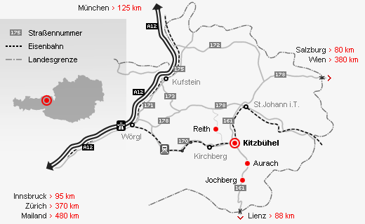 A8 направление на Зальцбург - треугольник долины Иннталь направление Куфштайн A93 - съезд Куфштайн Зюд (Kufstein Süd) - федеральная дорога  B178, направление Ст. Йоханн ин Тироль  (St. Johann in Tirol) - Пасс Турн (Pass Thurn), федеральная дорога B161, направление Китцбюэль. От Мюнхена на дорогу уйдет около 2 часов.