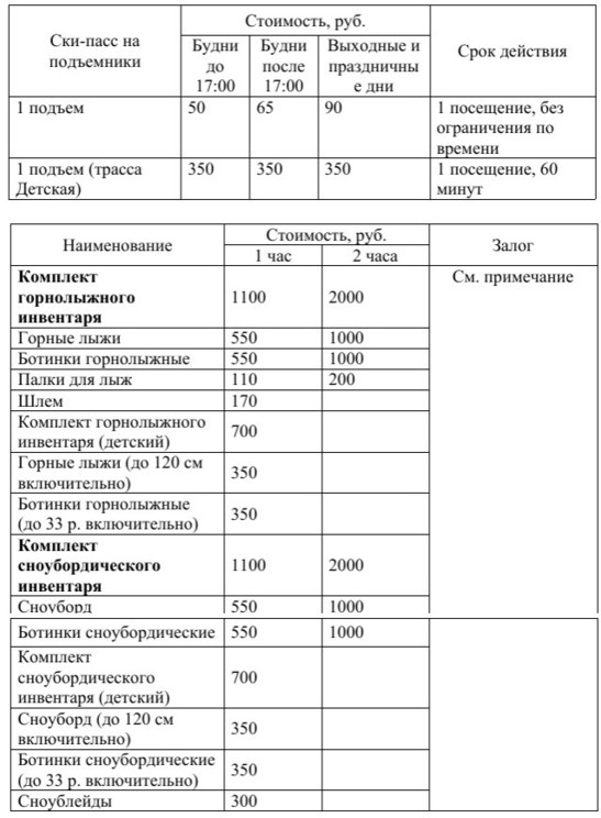 Все цены указаны в рублях, с учетом НДС (20%). Спортивный инвентарь выдается в прокат в соответствии с «Правилами пользования прокатом». При выдаче в прокат каждого комплекта снаряжения в обязательном порядке заключается Договор о предоставлении во временное пользование спортивного снаряжения между нанимателем и ГБУ ДО «Московская горнолыжная академия».