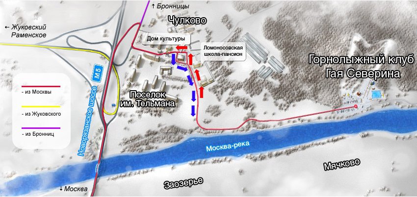 Личным автотранспортом. Первый вариант (Едем по Новорязанскому шоссе): из любой точки Москвы и области проехать до Новорязанского шоссе (продолжение Волгоградского проспекта, трасса М5) и следовать по нему 18 км. Вы оставляете позади рынок Автогарант, поворот на Быково, поселок Октябрьский, Мячково и деревню Заозёрье. Переехав эстакаду через Москва-реку, езжайте сначала немного левее, чтобы не уехать в сторону Жуковского, а на следующем съезде сворачивайте направо, и на перекрёстке поверните ещё раз направо. Будьте внимательны, вам нужно будет уступить дорогу. Выехав на дублёр Новорязанского шоссе, езжайте около 150 метров в сторону Москвы и поворачивайте налево в посёлок «Чулково». Проезжаете прямо вдоль магазинов, преодолев два «лежачих полицейских» перед Домом Культуры, (справа от вас, на нем находится вывеска – Кинотеатр»), поворачиваете направо под указатель «Горнолыжные склоны». Дальше едете по дороге (она единственная) 1 км. и попадаете в комплекс.