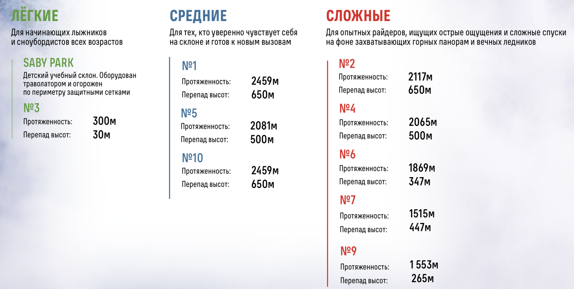 В Приэльбрусье есть две зоны катания. Маркированные трассы Эльбруса широкие, с комфортным уклоном, идеально подходят для обучения и спокойного катания.