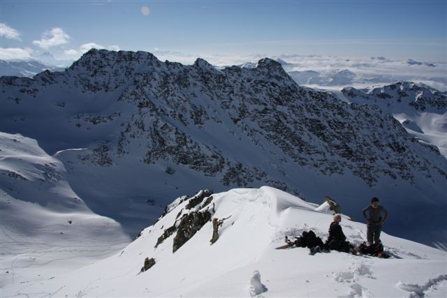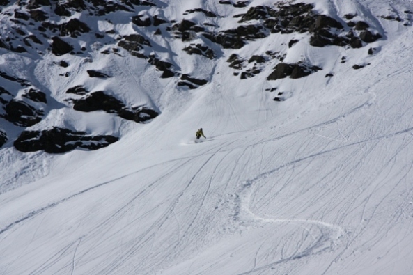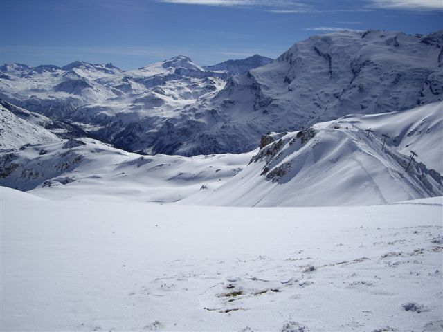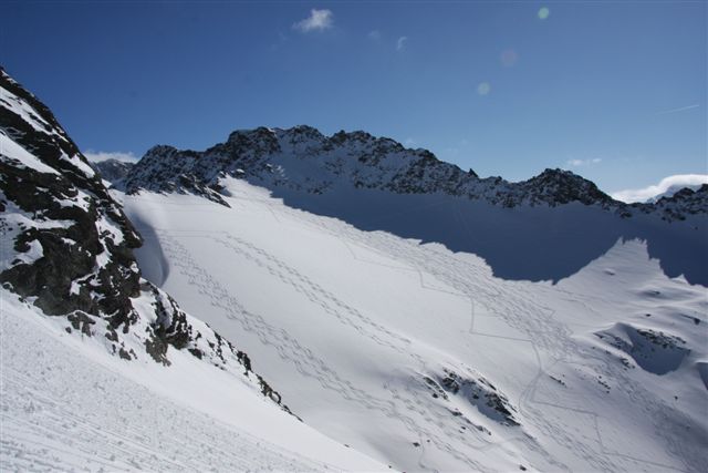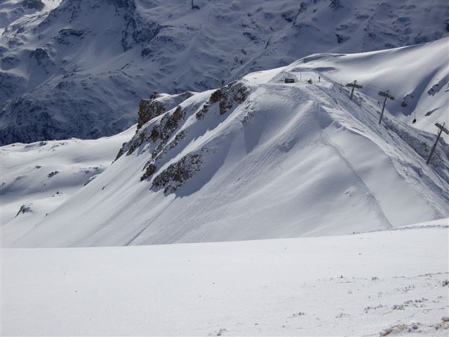 Вот она - левая половина склона с вершиной Foglietta - 2930 м. В верхней части, слева у подъемника - отличная крутая стенка (спасы так и не выпустили на нее до конца дня).