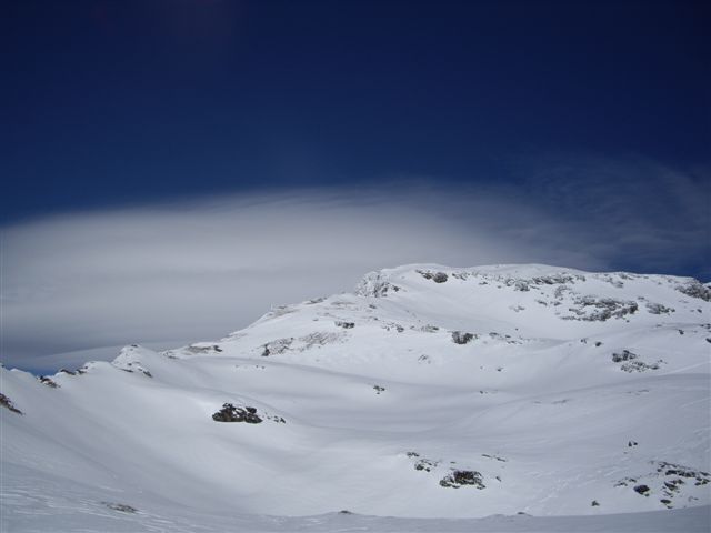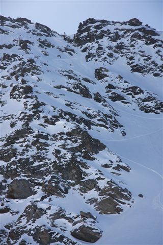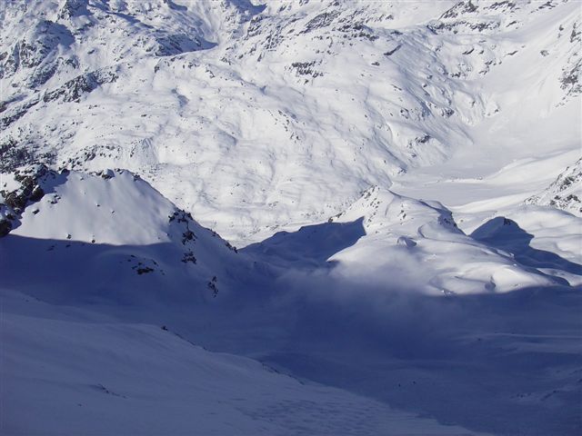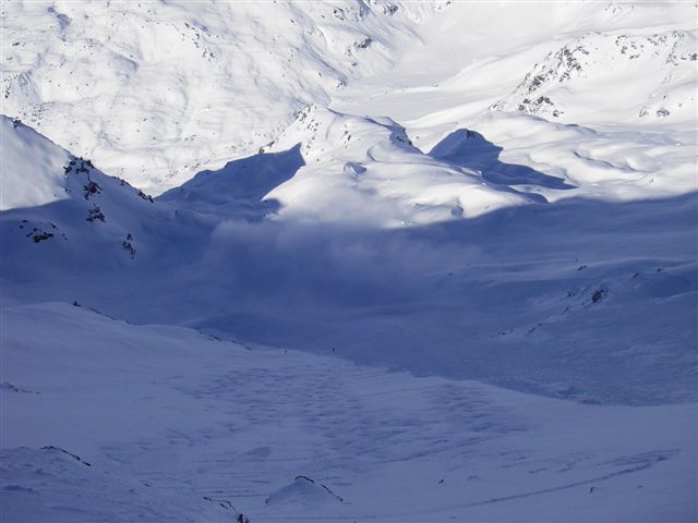 Половина северного склона по всей ширине до Монт (больше километра) с самого верха медленно поплыла вниз. Никакого грохота, самопроизвольно и спокойно (несмотря на крутизну). Объяснение одно - после снегопада появилось солнце, и на закате изменение температуры сделало свое дело.